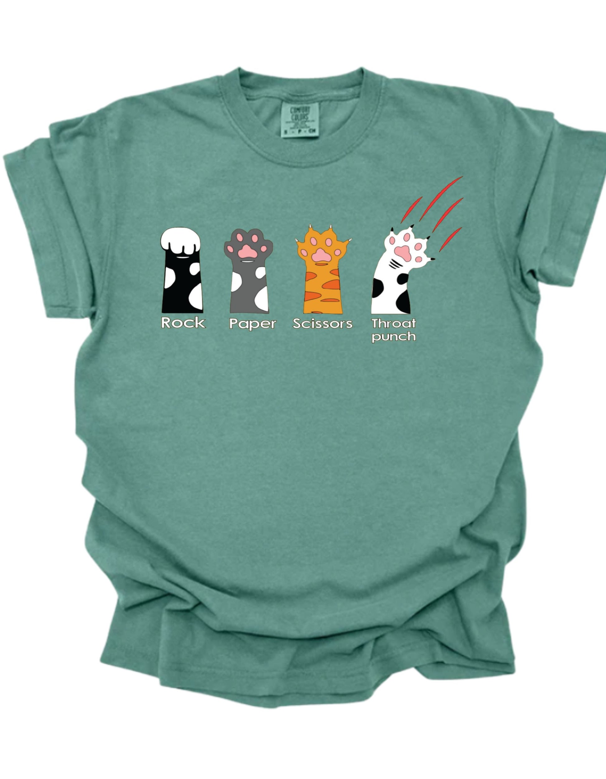 Introducing our Rock Paper Scissors Throat Punch humorous Comfort Colors Tee, made with 100% cotton. Perfect for cat lovers and anyone who appreciates clever humor. Get ready to make a bold statement and strike up a conversation with fellow feline enthusiasts.